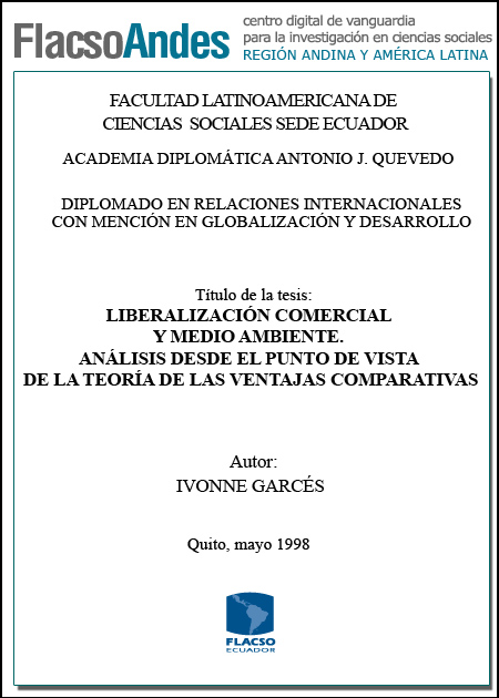 Garcés A., Ivonne (1998). Liberalización comercial y medio ambiente: análisis desde el punto de vista de la teoría de la ventajas comparativas. Diplomado en Relaciones Internacionales con Mención en Globalización y Desarrollo, FLACSO Sede Ecuador. Quito. 29 p.