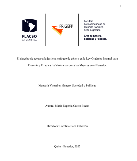 Castro Bueno, María Eugenia (2022). El derecho de acceso a la justicia : enfoque de género en la Ley Orgánica Integral para Prevenir y Erradicar la Violencia contra las Mujeres en el Ecuador. Tesis de Maestría. FLACSO. Sede Académica Argentina, Buenos Aires.