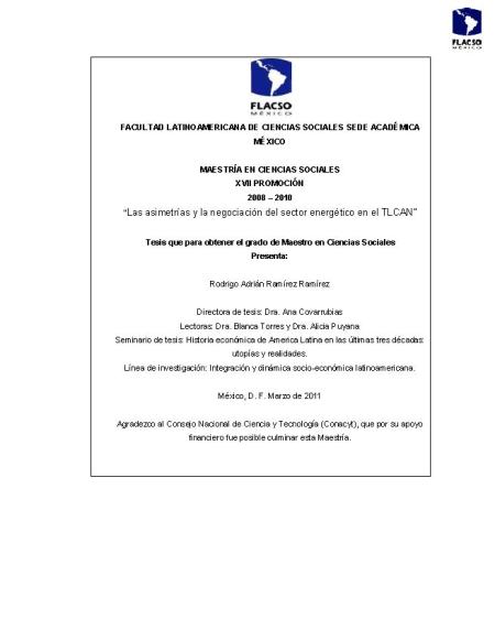 Ramírez Ramírez, Rodrigo Adrián (2011). Las asimetrías y la negociación del sector energético en el TLCAN. Maestría en Ciencias Sociales; FLACSO México. México. 109 h.