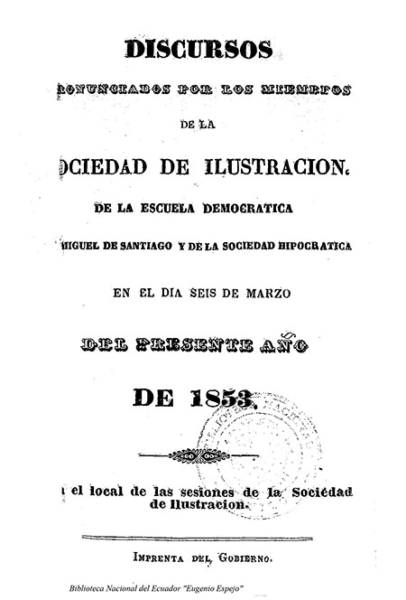 Sociedad de Ilustración de la Escuela Democrática de Miguel de Santiago .1853. Discursos pronunciados por los miembros de la Sociedad de Ilustración de la escuela democrática de Miguel de Santiago y de la Sociedad Hipocrática en el día seis de marzo del presente año de 1853 en el local de las sesiones de la Sociedad de Ilustración. Quito : Imprenta del Gobierno.