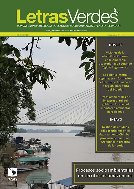 Flacso Ecuador (Facultad Latinoamericana de Ciencias Sociales Ecuador). Programa de Estudios Socioambientales. 2016. Procesos socioambientales en territorios amazónicos. Letras Verdes. Revista Latinoamericana de Estudios Socioambientales Flacso - Ecuador, 20.