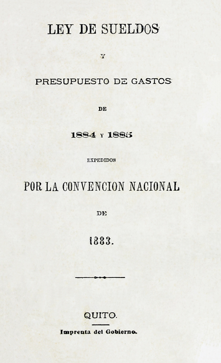 Congreso de la República de Ecuador. 1883. Ley de sueldos y presupuestos de gastos de 1884 y 1885 expedidos por la Convención Nacional de 1883