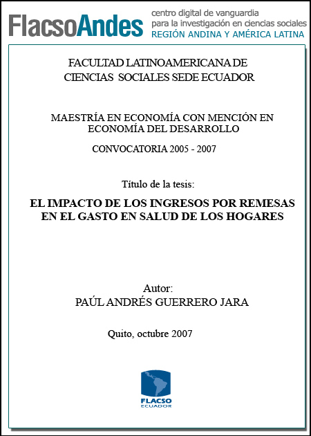 Guerrero Jara, Paúl Andrés (2007). El impacto de los ingresos por remesas en el gasto en salud de los hogares. Maestría en Economía; FLACSO sede Ecuador. Quito. 87 p.