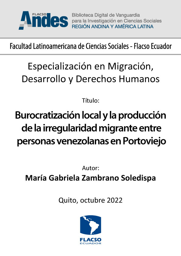 Zambrano Soledispa, María Gabriela. 2022. Burocratización local y la producción de la irregularidad migrante entre personas venezolanas en Portoviejo. Tesina de especialización, Flacso Ecuador.