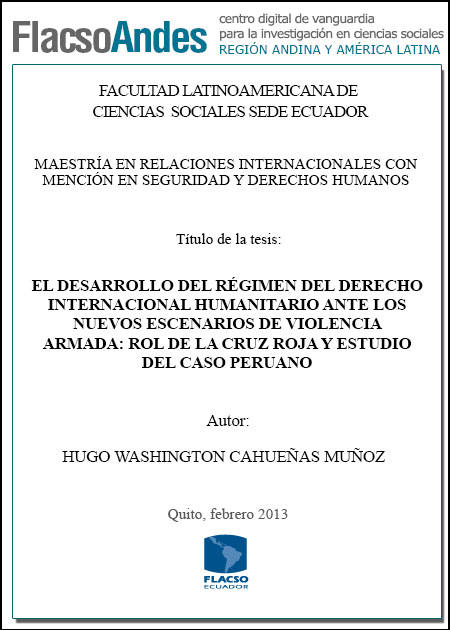 Cahueñas, H. W. (2013). El desarrollo del régimen de Derecho Internacional Humanitario ante los nuevos escenarios de violencia armada : rol de la Cruz Roja y estudio de caso peruano (Tesis de Maestría en Relaciones Internacionales con mención en Seguridad y Derechos Humanos). FLACSO Sede Ecuador, Quito.