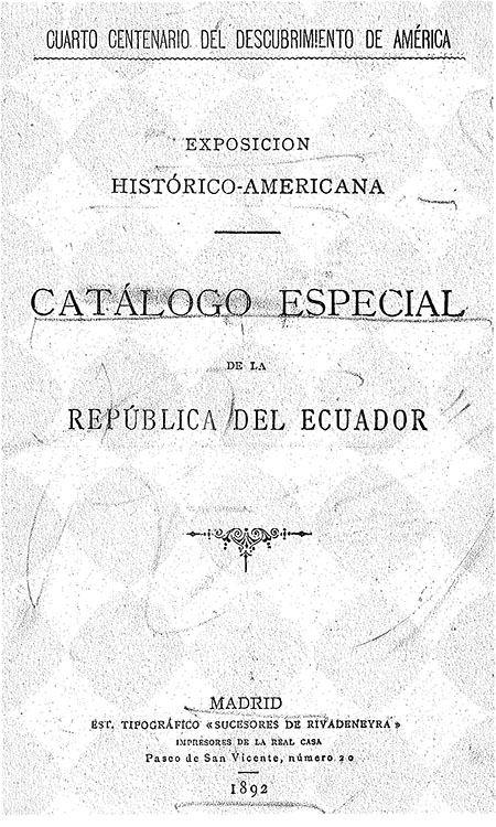Cuarto centenario del Descubrimiento de América : Exposición Histórico-Americana : Catálogo especial de La República del Ecuador. 1892. Madrid, España : Est. Tipográfico Sucesores de Rivadeneyra.