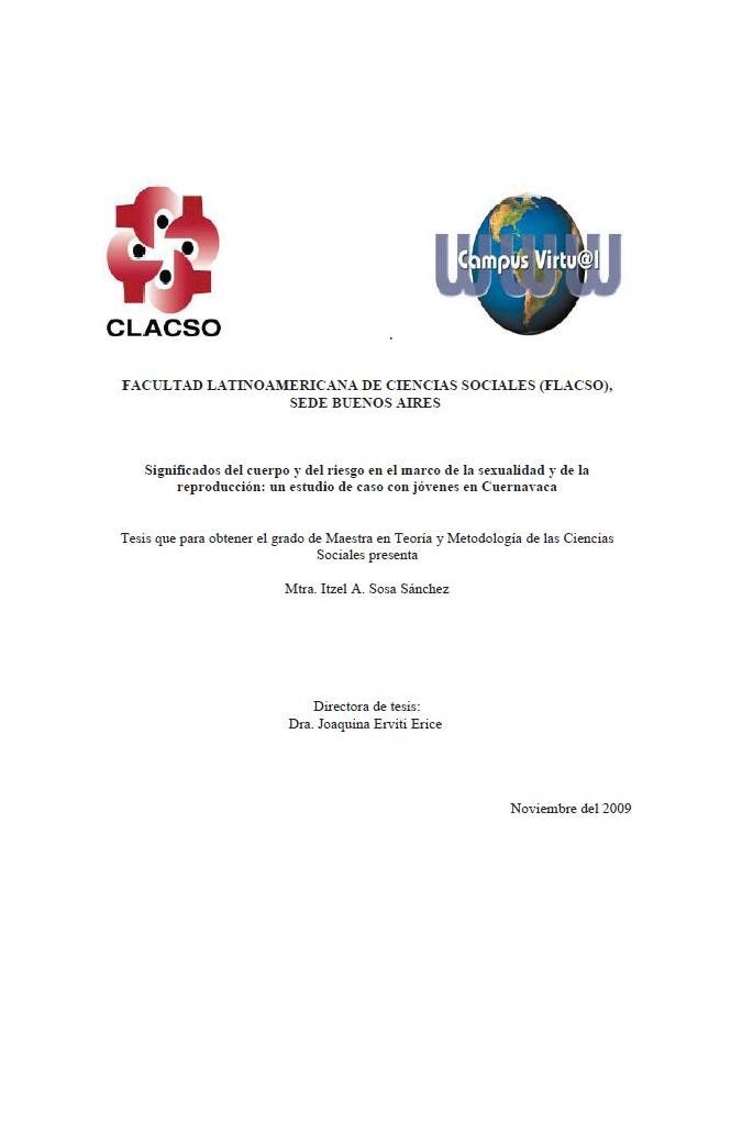Sosa Sánchez, Itzel Adriana (2010). Significados del cuerpo y del riesgo en el marco de la sexualidad y de la reproducción : un estudio de caso con jóvenes en Cuernavaca. Tesis de Maestría. FLACSO. Sede Académica Argentina; CLACSO, Buenos Aires.