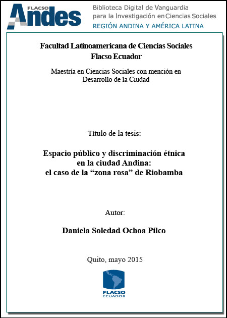 Ochoa Pilco, Daniela Soledad. 2015. Espacio público y discriminación étnica en la ciudad Andina : el caso de la "zona rosa" de Riobamba. Tesis de maestría, Flacso Ecuador.