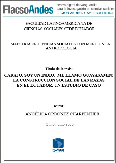 Ordóñez Charpentier, Angélica (2000). Carajo soy un indio me llamo Guayasamín: la construcción social de las razas en el Ecuador. Un estudio de caso. Maestría en Ciencias Sociales, mención Estudios Ecuatorianos; FLACSO sede Ecuador. Quito. 136 p.