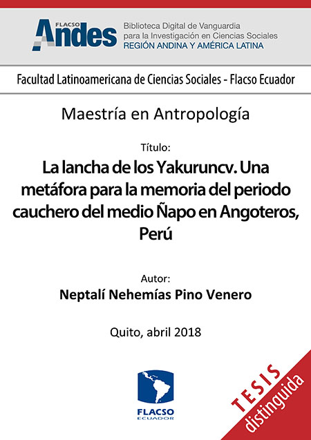 Pino Venero, Neptalí Nehemías. 2018. La lancha de los Yakuruncv. Una metáfora para la memoria del periodo cauchero del medio Ñapo en Angoteros, Perú. Tesis de maestría, Flacso Ecuador.