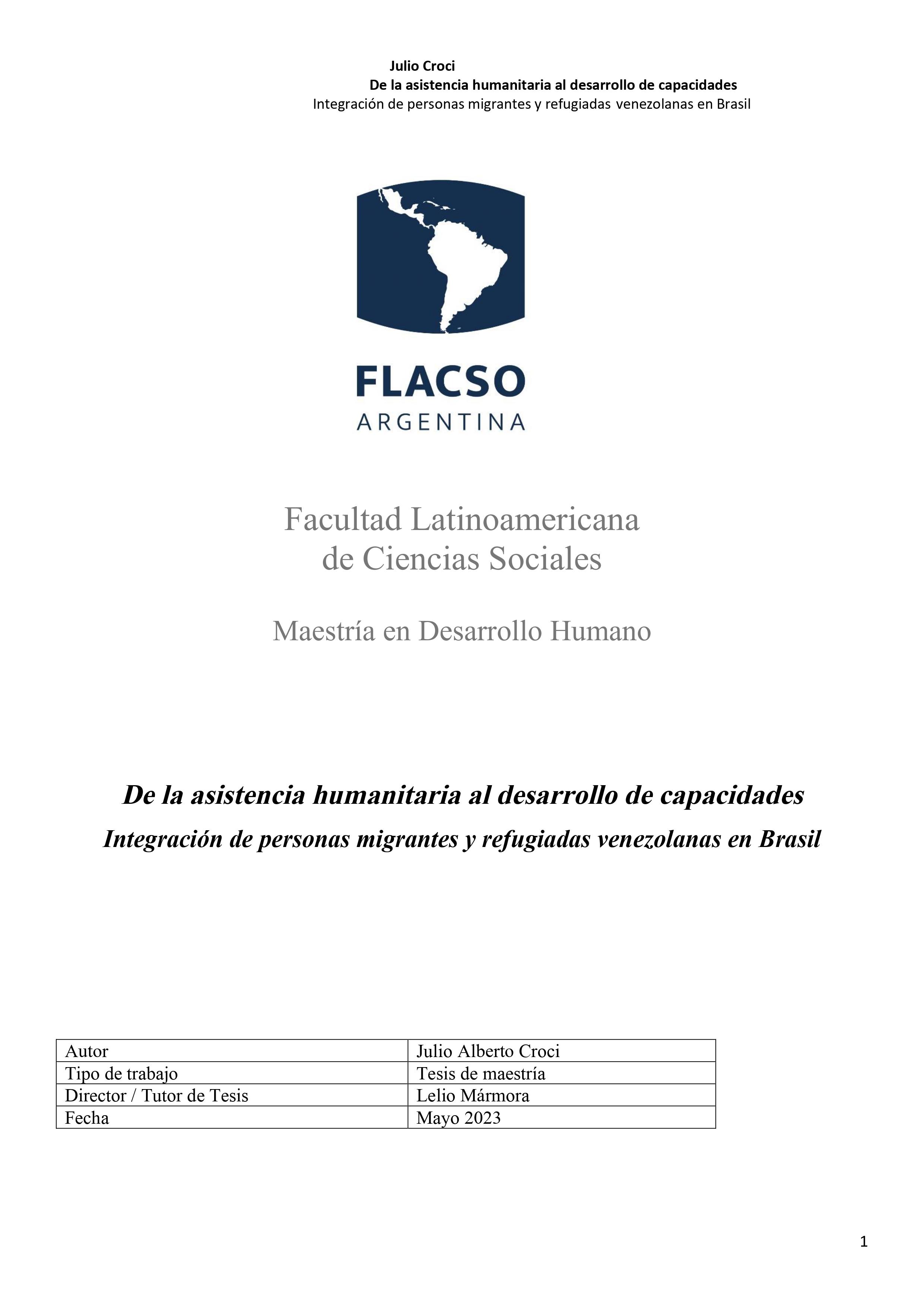 Croci, Julio Alberto (2023). De la asistencia humanitaria al desarrollo de capacidades: integración de personas migrantes y refugiadas venezolanas en Brasil. Tesis de Maestría. FLACSO. Sede Académica Argentina, Buenos Aires.