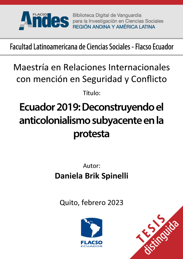 Brik Spinelli, Daniela. 2023. Ecuador 2019: Deconstruyendo el anticolonialismo subyacente en la protesta. Tesis de maestría, Flacso Ecuador.