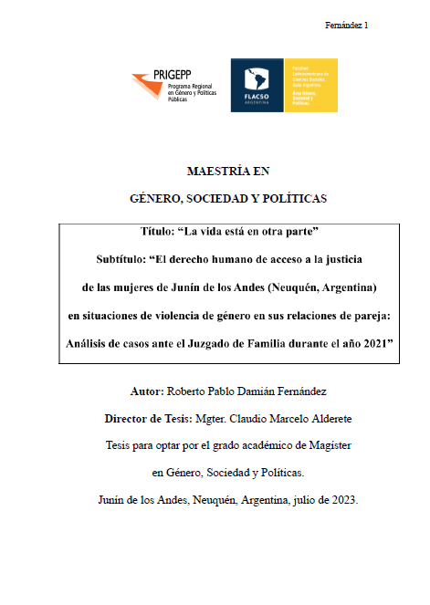 Fernández, Roberto Pablo Damián (2023). La vida está en otra parte: el derecho humano de acceso a la justicia de las mujeres de Junín de los Andes (Neuquén, Argentina) en situación de violencia de género en sus relaciones de pareja: análisis de casos ante el Juzgado de Familia durante el año 2021. Tesis de Maestría. FLACSO. Sede Académica Argentina, Buenos Aires.