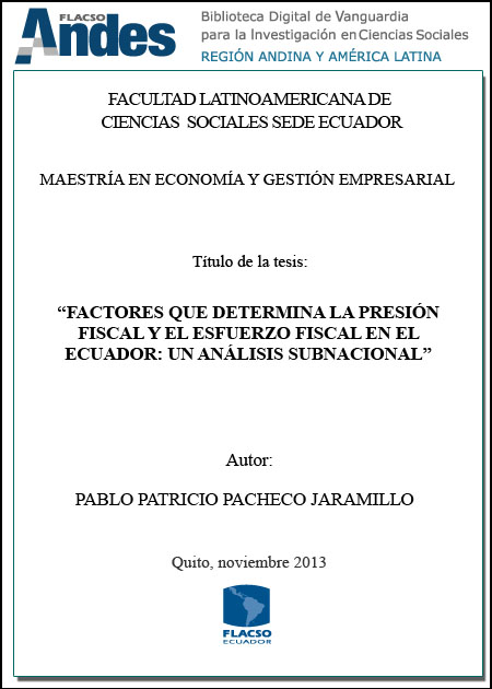 Pacheco Jaramillo, Pablo Patricio. 2013. Factores que determina la presión fiscal y el esfuerzo fiscal en el Ecuador: un análisis subnacional. Tesis de maestría, Flacso Ecuador.