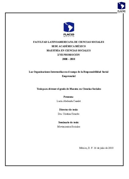 Abelenda Casalet, Lucía (2010). Las organizaciones intermedias en el campo de la responsabilidad social empresarial. Maestría en Ciencias Sociales; FLACSO – Sede Académica de México. México. 174 h.