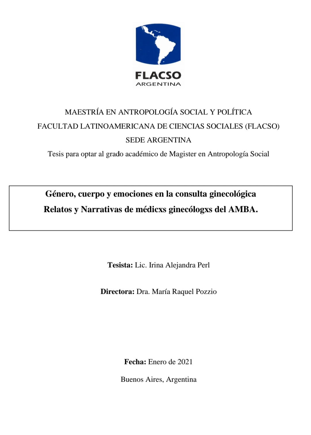 Perl, Irina Alejandra. (2021). Género, cuerpo y emociones en la consulta ginecológica : relatos y narrativas de médicxs ginecólogxs del AMBA. Tesis de Maestría. FLACSO. Sede Académica Argentina, Buenos Aires.
