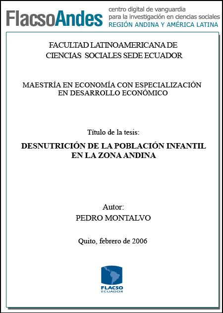 Montalvo, Pedro (2006). Desnutrición de la población infantil en la zona andina. Maestría en Economía con especialización en Desarrollo Económico; FLACSO sede Ecuador. Quito. 112 p.