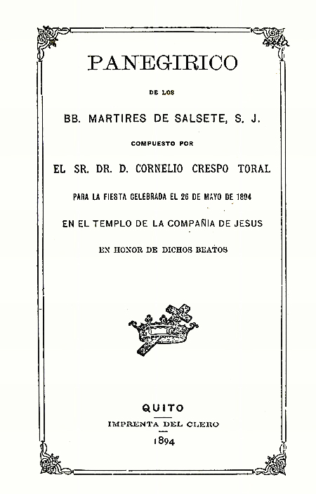 Crespo Toral, Cornelio. 1894. Panegírico de los BB. mártires de Salsete, S. J. compuesto por el Sr. Dr. D. Cornelio Crespo Toral para la fiesta celebrada el 26 de mayo de 1894 en el Templo de la Compañía de Jesús en honor de dichos beatos. Quito, Ecuador : Imprenta del Clero.