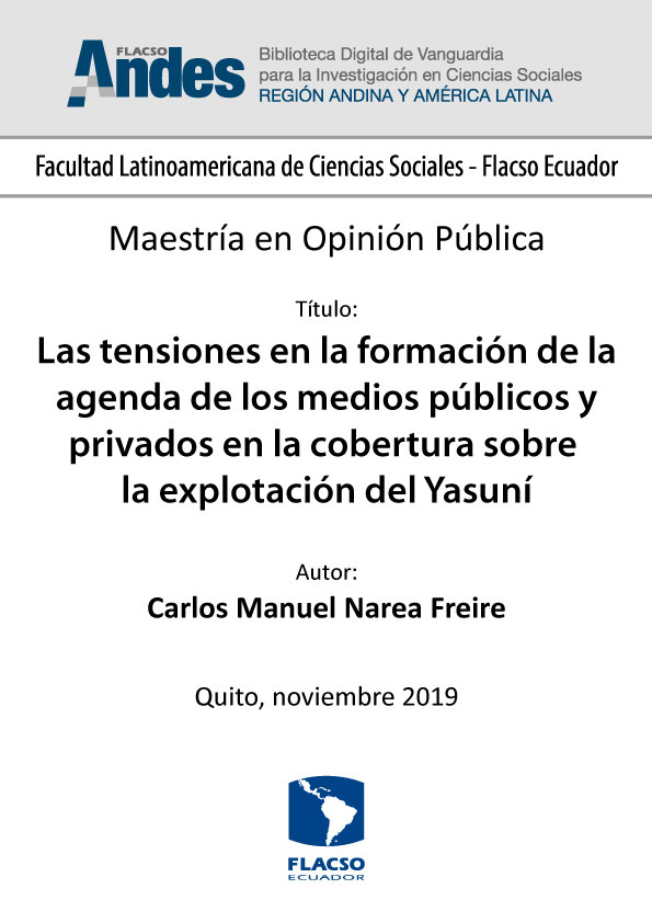 Narea Freire, Carlos Manuel. 2019. Las tensiones en la formación de la agenda de los medios públicos y privados en la cobertura sobre la explotación del Yasuní. Tesis de maestría, Flacso Ecuador.
