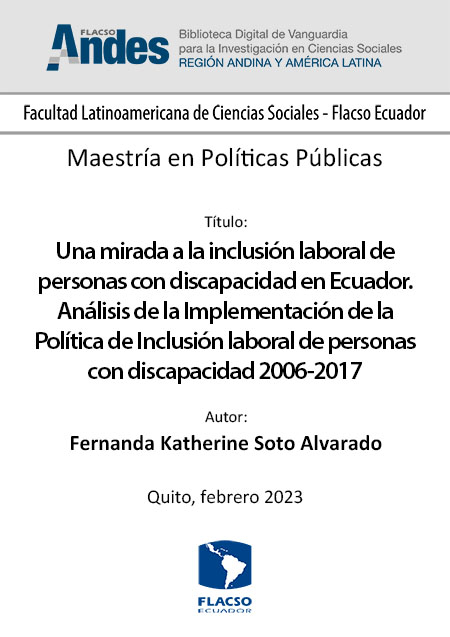 Soto Alvarado, Fernanda Katherine. 2023. Una mirada a la inclusión laboral de personas con discapacidad en Ecuador. Análisis de la Implementación de la Política de Inclusión laboral de personas con discapacidad 2006-2017. Tesis de maestría, Flacso Ecuador.