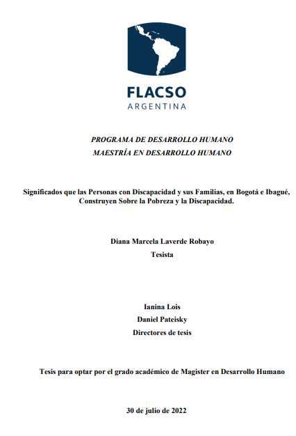 Laverde Robayo, Diana Marcela (2022). Significados que las personas con discapacidad y sus familias, en Bogotá e Ibagué, construyen sobre la pobreza y la discapacidad. Tesis de Maestría. FLACSO. Sede Académica Argentina, Buenos Aires.
