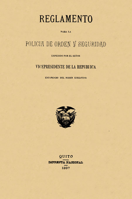 Cueva, Manuel B. 1897. Reglamento para la Policía de Orden y Seguridad expedido por el Señor Vicepresidente de la República encargado del poder ejecutivo. Quito, Ecuador : Imprenta Nacional.