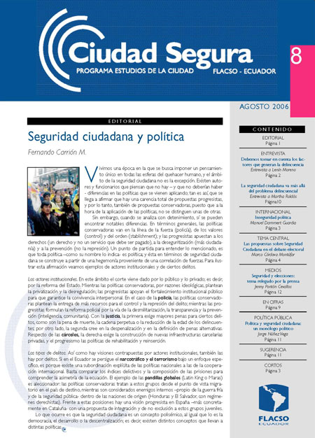 Ciudad segura. FLACSO sede Ecuador. Programa de Estudios de la Ciudad. Quito: FLACSO, (no. 08, agosto 2006): 12 p.