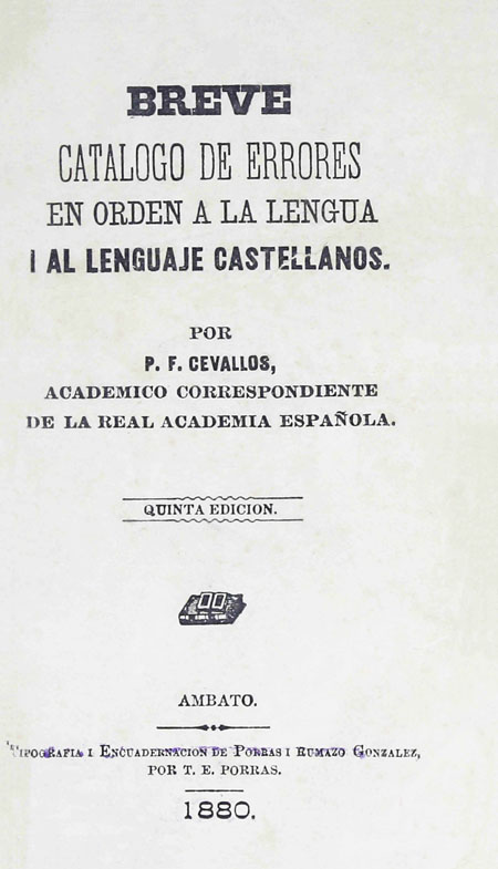 Cevallos, P. F. 1880. Breve catálgo de errores en orden a la lengua, al lenguaje castellanos. Ambato, Ecuador : Tipografía i Encuadernación de Porras i Rumazo González, por T. E. Porras.