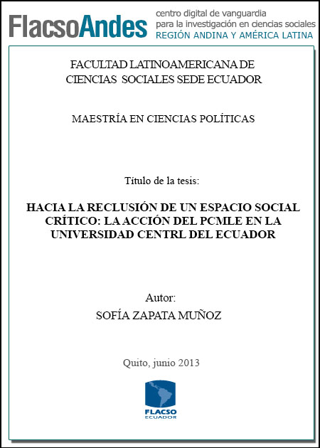 Zapata Muñoz, Sofía. 2013. Hacia la reclusión de un espacio social crítico: la acción del PCMLE en el Universidad Central del Ecuador. Tesis de maestría, Flacso Ecuador.