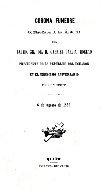 Oración fúnebre pronunciada en las exequias que se celebraron el 6 de agosto de 1885, décimo aniversario de la muerte de García Moreno, en la Iglesia de la Compañía de Jesús.