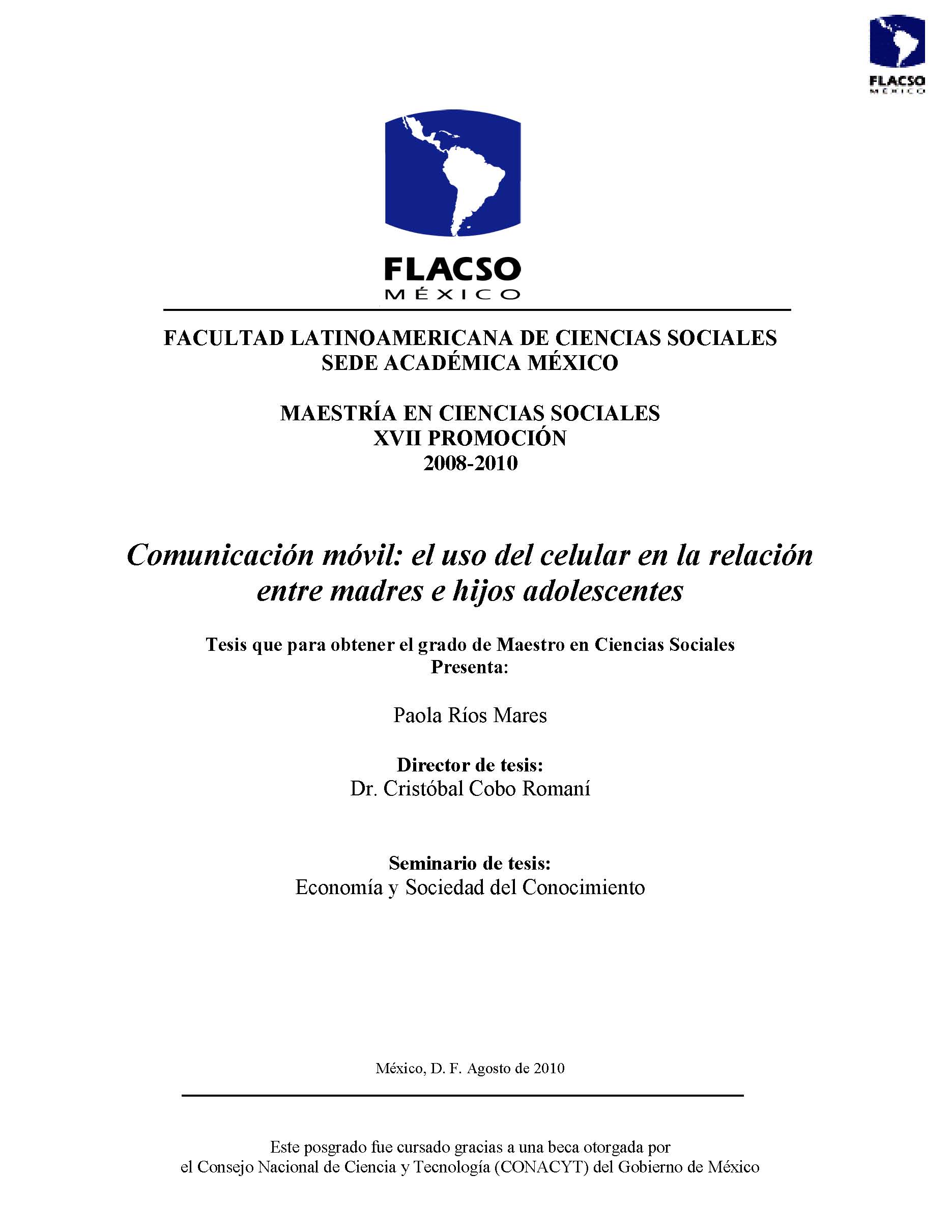 Ríos Mares, Paola (2010). Comunicación móvil : el uso del celular en la relación entre madres e hijos adolescentes. Maestría en Ciencias Sociales; FLACSO México. México. 140 h.