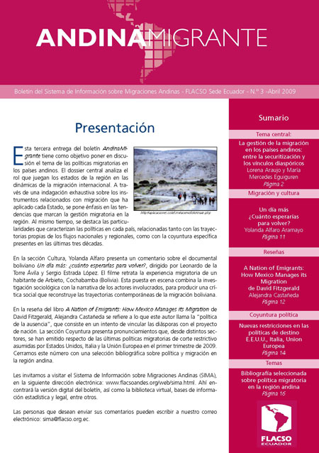 Andina Migrante. FLACSO sede Ecuador. Programa de Sociología, Sistema de Información sobre Migraciones Andinas. Quito: FLACSO, (no. 3, abril 2009): 16 p.
