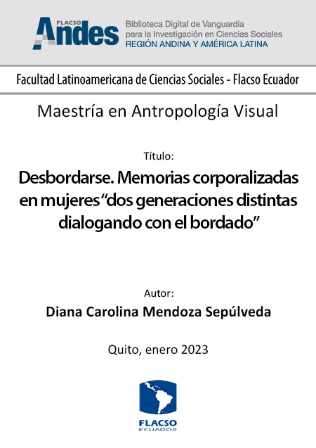Mendoza Sepúlveda, Diana Carolina. 2023. Desbordarse. Memorias corporalizadas en mujeres “dos generaciones distintas dialogando con el bordado”. Tesis de maestría, Flacso Ecuador.