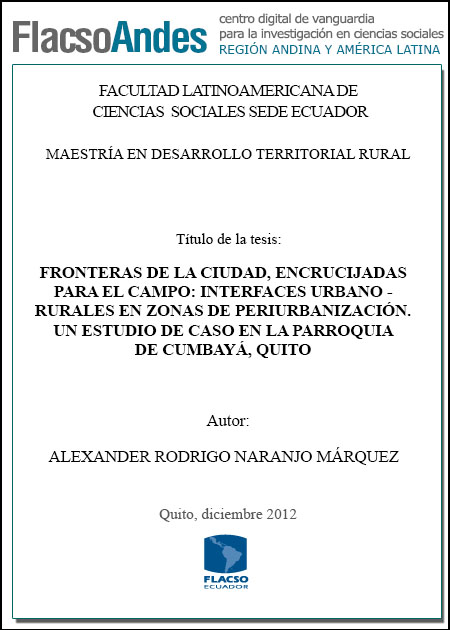Naranjo, A. R. (2012). Fronteras de la ciudad, encrucijadas para el campo : interfaces urbano-rurales en zonas periurbanización, un estudio de caso en la Parroquia de Cumbayá, Quito (Tesis de Maestría en Desarrollo Territorial Rural). FLACSO Sede Ecuador, Quito.
