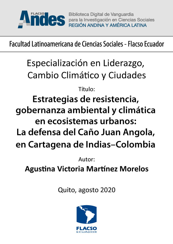 Martínez Morelos, Agustina Victoria. 2020. Estrategias de resistencia, gobernanza ambiental y climática en ecosistemas urbanos: La defensa del Caño Juan Angola, en Cartagena de Indias–Colombia. Tesina de especialización, Flacso Ecuador.