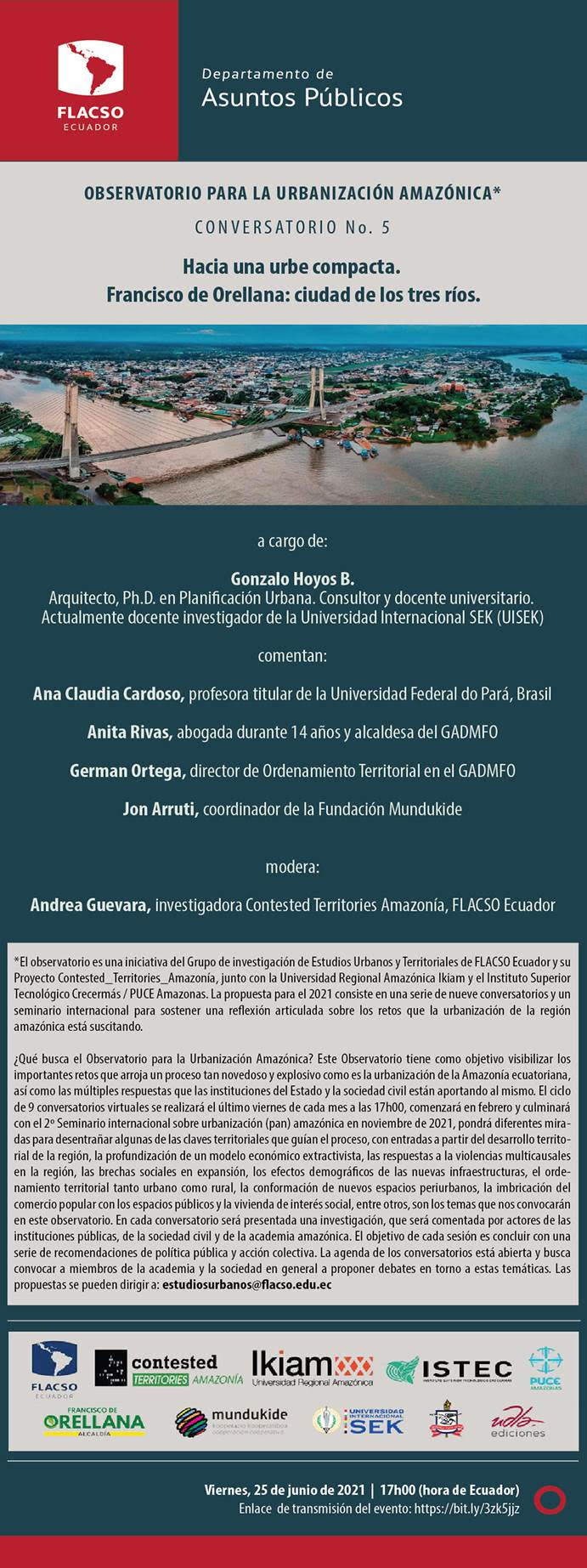 FLACSO Ecuador invita al Observatorio para la urbanización amazónica. Conversatorio No. 5. Hacia una urbe compacta. Francisco de Orellana: ciudad de los tres ríos, el 25 de junio de 2021- 17h00 : FLACSO Ecuador, Quito.