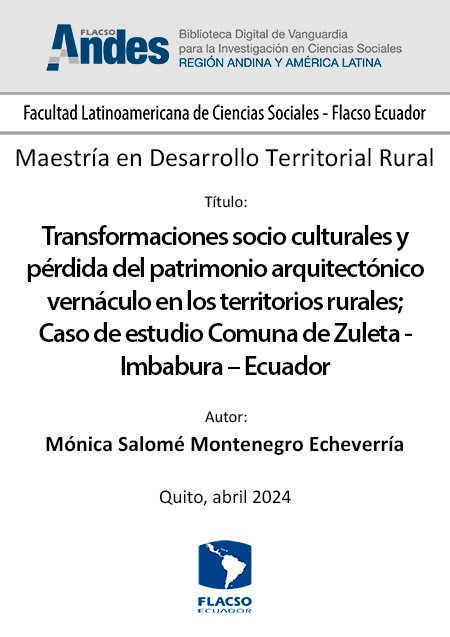 Montenegro Echeverría, Mónica Salomé. 2024. Transformaciones socio culturales y pérdida del patrimonio arquitectónico vernáculo en los territorios rurales; Caso de estudio Comuna de Zuleta - Imbabura – Ecuador. Tesis de maestría, Flacso Ecuador.