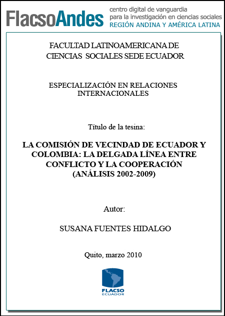 Fuentes Hidalgo, Susana (2010). La comisión de vecindad de Ecuador y Colombia : la delgada línea entre conflicto y la cooperación (Análisis 2002 - 2009), Especialización en Relaciones Internacionales, FLACSO Sede Ecuador. Quito, 50 p.