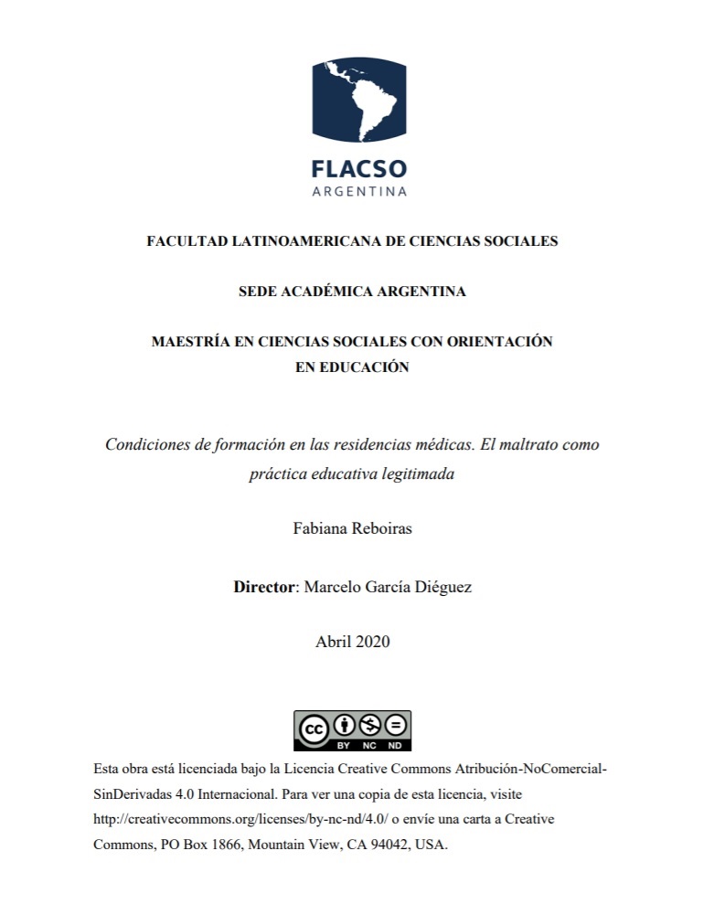 Reboiras, Fabiana. 2020. Condiciones de formación en las residencias médicas : el maltrato como práctica educativa legitimada. Tesis de Maestría. FLACSO. Sede Académica Argentina, Buenos Aires.