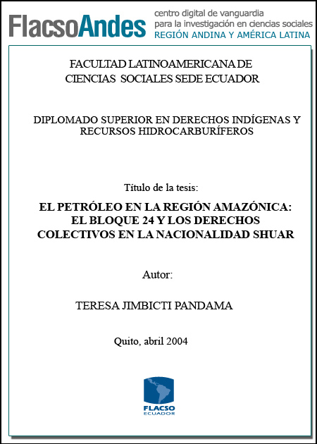 Jimbicti Pandama, Teresa (2004). El petróleo en la Región Amazónica el bloque 24 y los derechos colectivos en la nacionalidad Shuar. Diplomado Superior en Derechos Indígenas y Recursos Hidrocarburíferos. FLACSO - Sede Ecuador. Quito. 100 p.