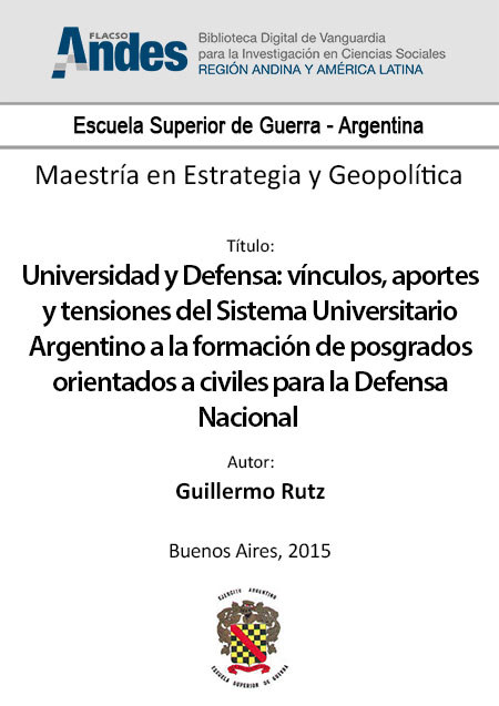 Rutz, Roque Guillermo. 2015. Universidad y Defensa: vínculos, aportes y tensiones del Sistema Universitario Argentino a la formación de posgrados orientados a civiles para la Defensa Nacional. Tesis de maestría, Instituto Universitario del Ejército.