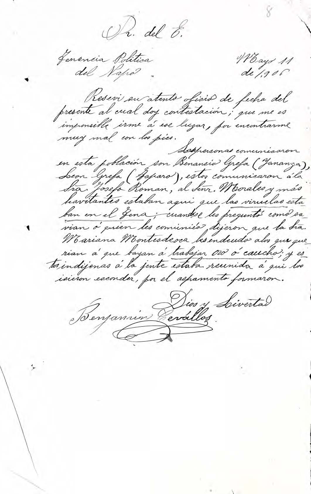 Revisado por Blanca Muratorio en 2001, el sobre 9 reúne documentos relacionados con el trabajo de personas indígenas, para mujeres en el Tena, durante las primeras décadas del siglo XX. Así, se observan libros de cuentas que registran el cobro de herramientas de trabajo, pólvora, municiones, vestimenta, alimentos y objetos suntuarios. Aunque, en su mayoría, las liquidaciones de deudas se registran como simples cuentas, algunas se componen de declaraciones que evidencian violencias y abusos hacia trabajadores y trabajadoras indígenas. No obstante, también se registra interés por parte de las autoridades a garantizar liquidaciones en las que se tomen en cuenta los intereses de ambas partes. Años aproximados de los documentos: 1905, 1906, 1926, 1930, 1939.