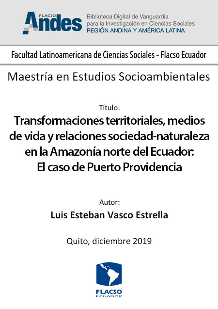 Vasco Estrella, Luis Esteban. 2019. Transformaciones territoriales, medios de vida y relaciones sociedad-naturaleza en la Amazonía norte del Ecuador: El caso de Puerto Providencia. Tesis de maestría, Flacso Ecuador.