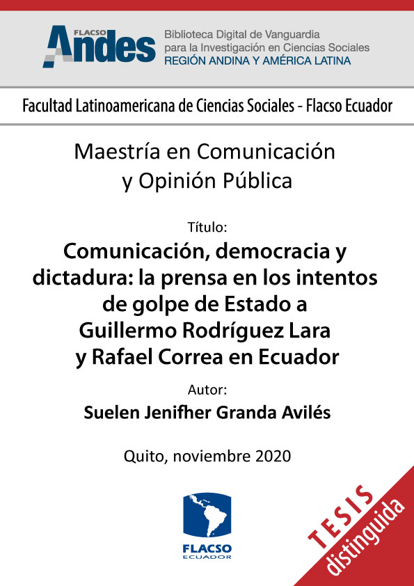 Granda Avilés, Suelen Jenifher. 2020. Comunicación, democracia y dictadura: la prensa en los intentos de golpe de Estado a Guillermo Rodríguez Lara y Rafael Correa en Ecuador. Tesis de maestría, Flacso Ecuador.
