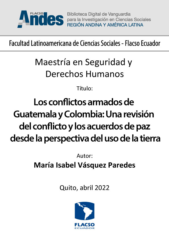 Vásquez Paredes, María Isabel. 2022. Los conflictos armados de Guatemala y Colombia: Una revisión del conflicto y los acuerdos de paz desde la perspectiva del uso de la tierra. Tesis de maestría, Flacso Ecuador.