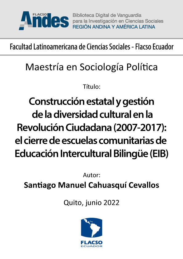 Cahuasquí Cevallos, Santiago Manuel. 2022. Construcción estatal y gestión de la diversidad cultural en la Revolución Ciudadana (2007-2017): el cierre de escuelas comunitarias de Educación Intercultural Bilingüe (EIB). Tesis de maestría, Flacso Ecuador.