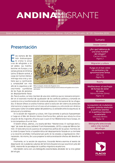 Este número del Boletín Andina migrante analiza la actual crisis de refugiados a nivel global, sus manifestaciones en Europa y sus consecuencias en América Latina. El dossier central, a cargo de Carmen Gómez, interroga esta crisis y sostiene que su significación y complejidad van más allá de la coyuntura y del crecimiento cuantitativo de los flujos de personas en desplazamiento forzado. Para la autora, se trata más bien de una crisis sistémica que es necesario comprender en el escenario mundial de agudización de los conflictos políticos y tomando en cuenta la crisis y transformación del sistema de protección internacional de los refugiados.