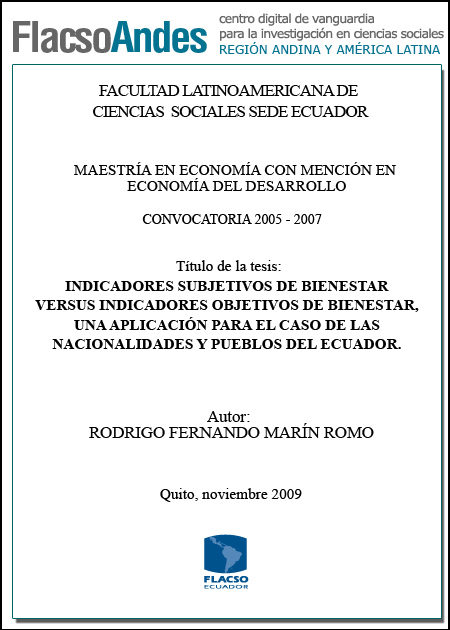 Marín Romo, Rodrigo Fernando (2009). Indicadores subjetivos de bienestar versus indicadores objetivos de bienestar del Ecuador, una aplicación para el caso de las nacionalidades y pueblos. Maestría en Ciencias Sociales con mención en Economía del Desarrollo. FLACSO, Sede Ecuador. Quito. vi, 45 p.