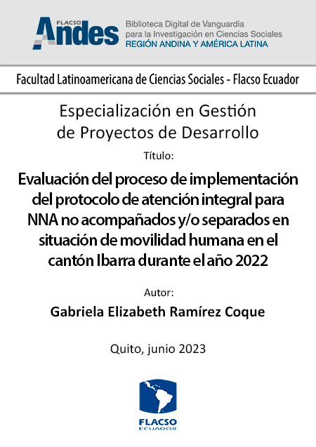 Ramírez Coque, Gabriela Elizabeth. 2023. Evaluación del proceso de implementación del protocolo de atención integral para NNA no acompañados y/o separados en situación de movilidad humana en el cantón Ibarra durante el año 2022. Tesina de especialización, Flacso Ecuador.