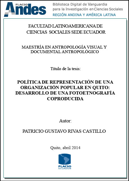 Rivas Castillo, Patricio Gustavo. 2014. Política de representación de una organización popular en Quito: Desarrollo de una fotoetnografía coproducida. Tesis de maestría, Flacso sede Ecuador.